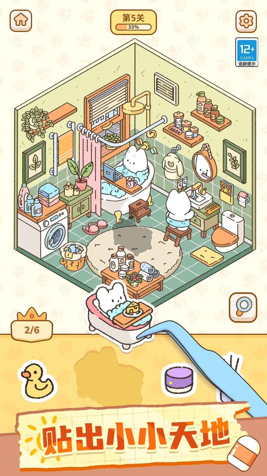 1、房间以简单剪影呈现,像待填色的画布,玩家需从海量贴纸中找匹配款式,贴对后单调线条瞬间变丰富温馨。