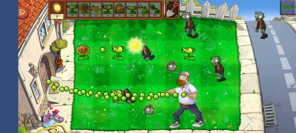1、角色互动增添趣味,农场主人戴夫加入战斗行列,手持武器直面僵尸威胁,与植物防御形成互补作战模式。